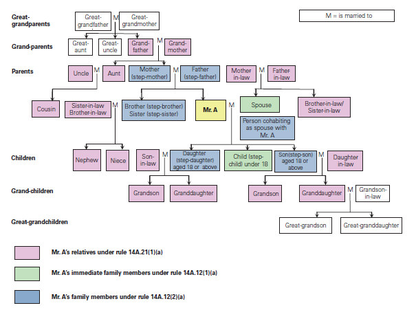 - a person cohabiting with him as a spouse, or his child, step-child, parent, step-parent, sibling or step-sibling (each a “family member”)(LR14A.12(2)(a));